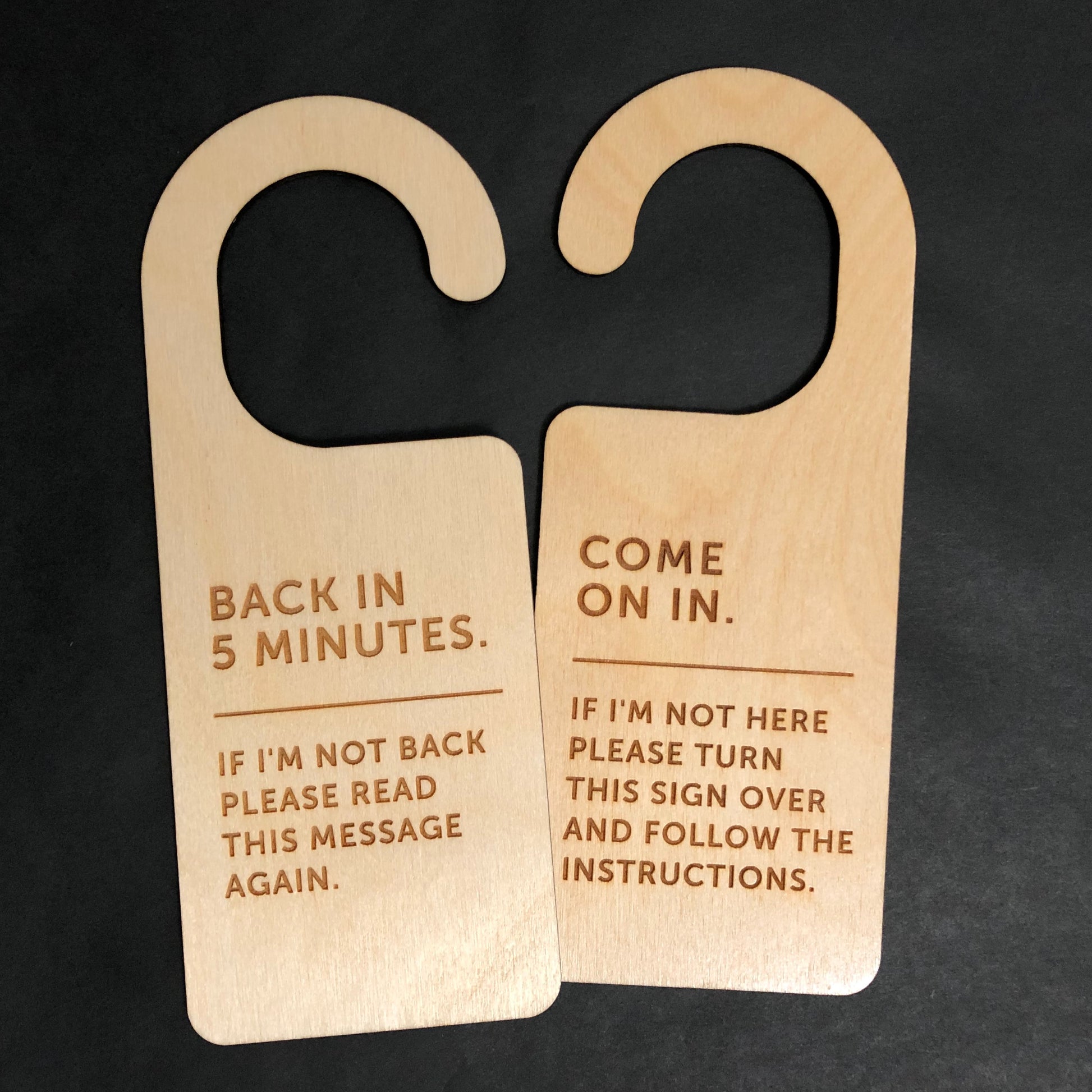 The Back In 5 Minutes door hanger design is laser engraved into natural birch plywood. The door hanger is hand-finished on both sides, then double-coated in a protective clear semi-gloss polycrylic for a clean finish. Because natural wood-grain is unique, each door hanger will differ slightly from photos. Knots and dark spots are possible, which adds to the authentic look.
