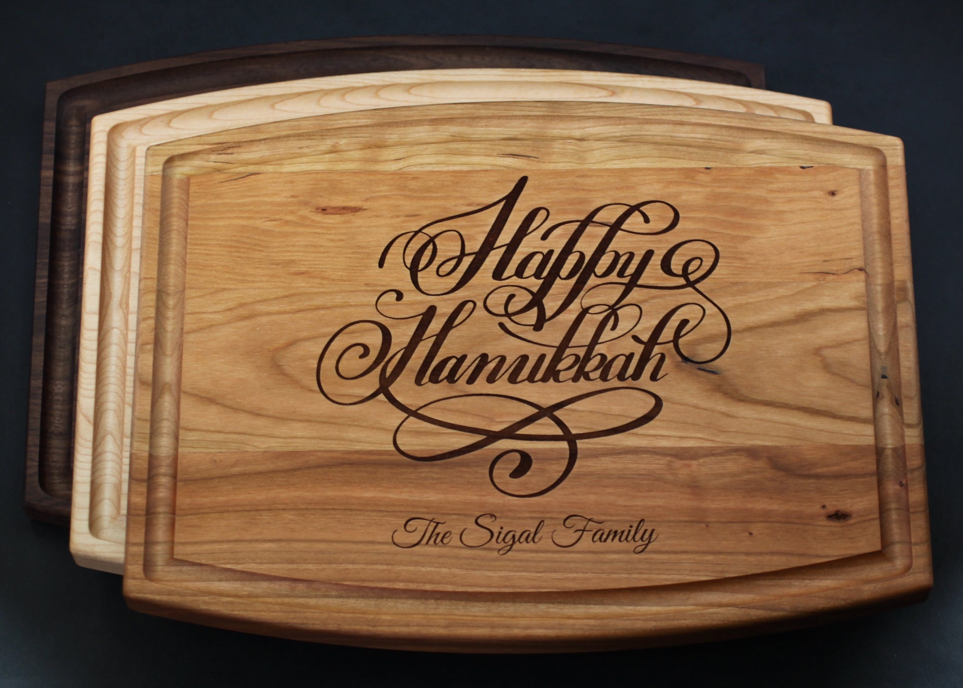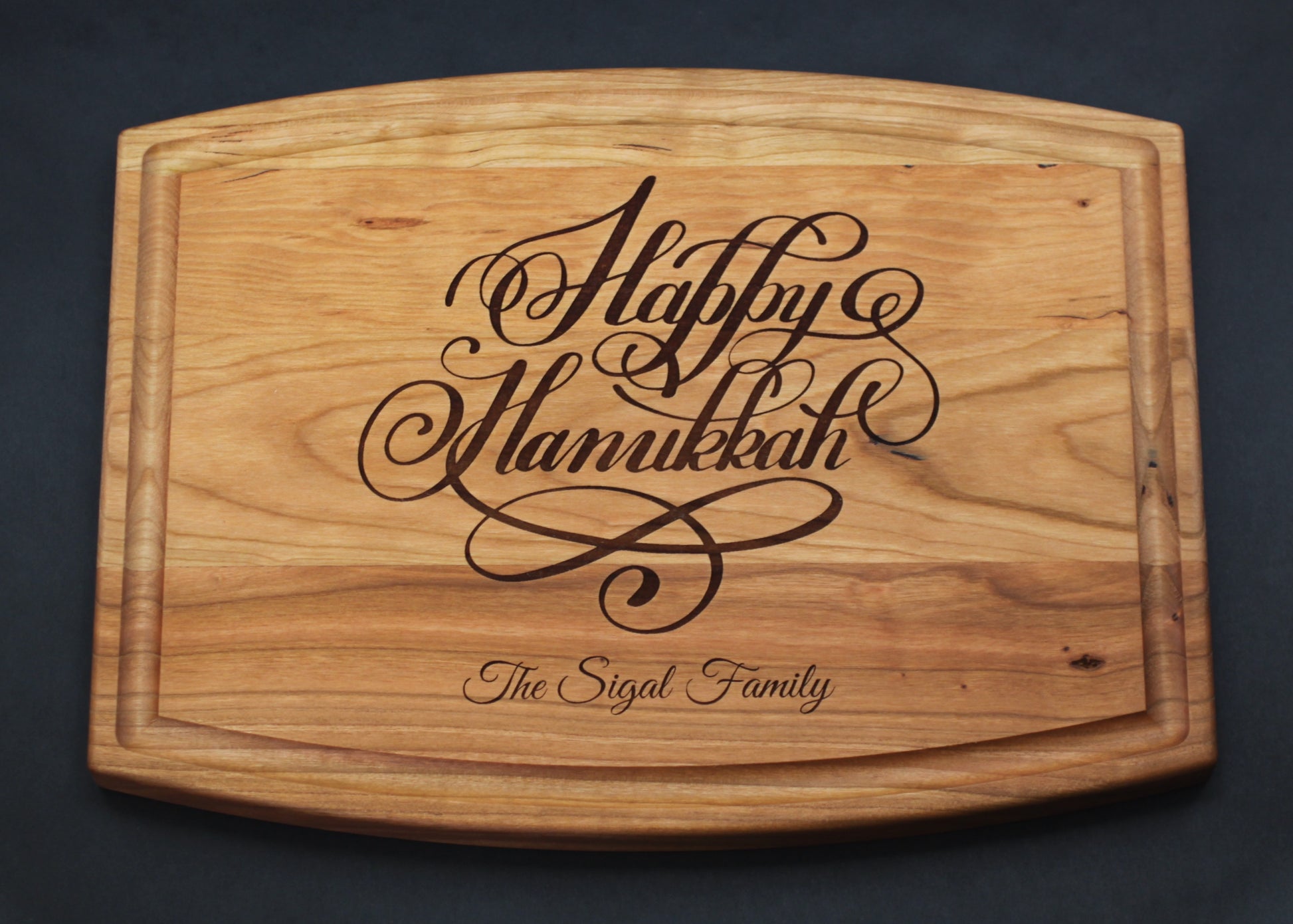 This high-quality cutting board, engraved with Happy Hanukkah and personalized with your family name or short phrase, makes an unforgettable Holiday centerpiece and gorgeous Hanukkah serving board. Our laser engraved cutting boards makes a memorable gift. Truly unique, this premium hardwood cutting board is easy to maintain and gentle on knives. The lasting beauty of the Happy Hanukkah engraving makes it one of our top selling Hanukkah cutting boards.