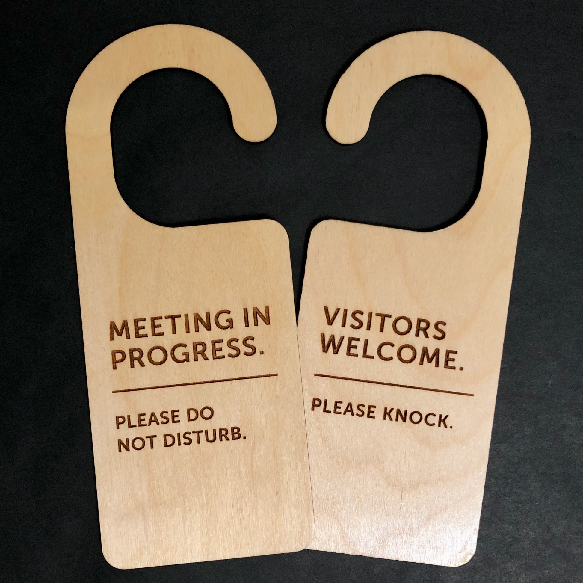 This Meeting In Progress Sign / Do Not Disturb door hanger design is laser engraved into natural birch plywood. The door hanger is hand-finished on both sides, then double-coated in a protective clear semi-gloss polycrylic for a clean finish. Because natural wood-grain is unique, each door hanger will differ slightly from photos. Knots and dark spots are possible, which adds to the authentic look.
