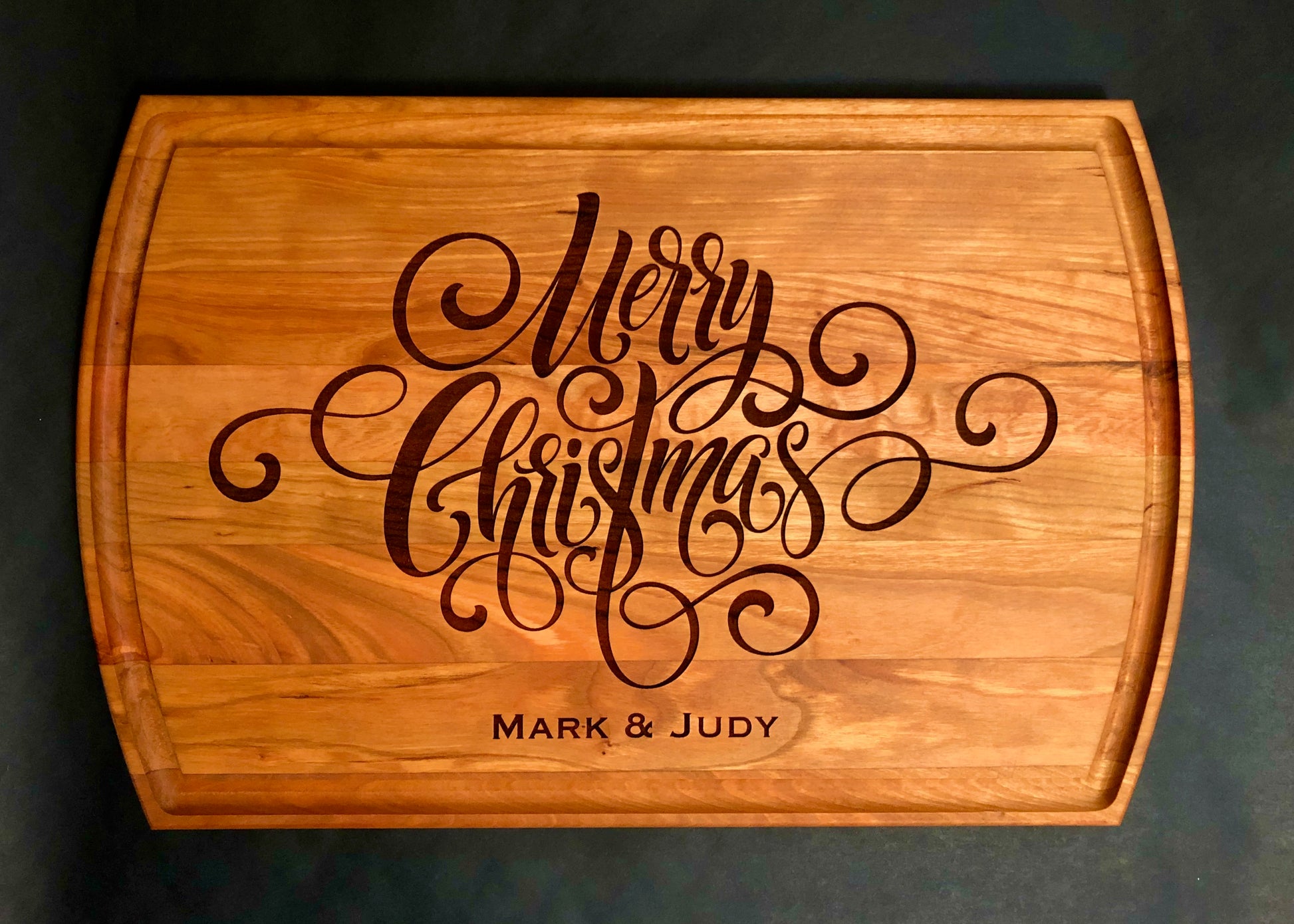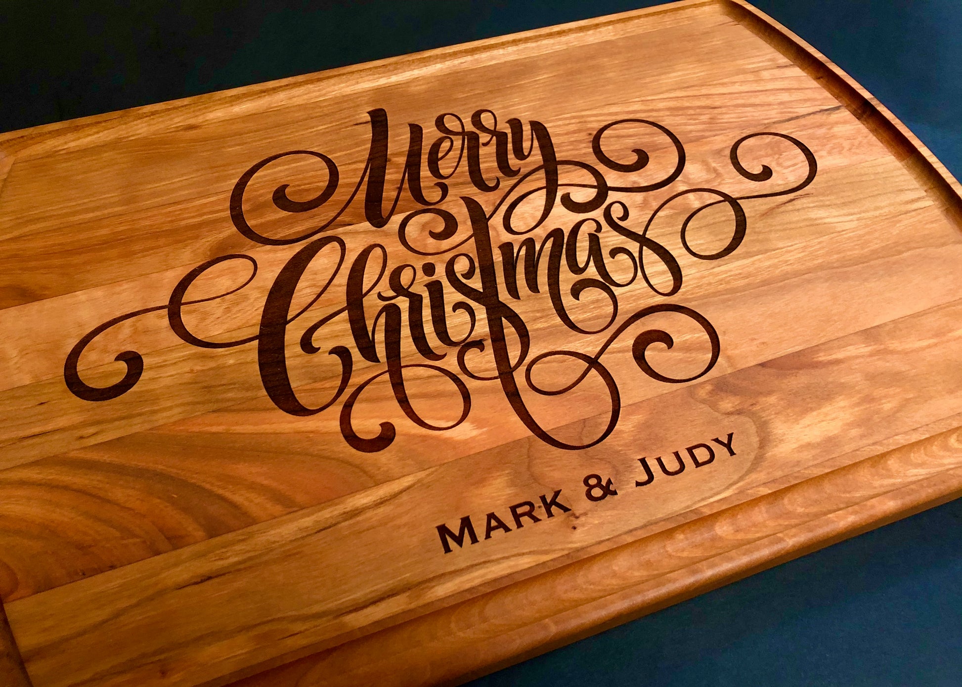 This high-quality cutting board, engraved with Merry Christmas and personalized with your family name or short phrase, makes an unforgettable Christmas centerpiece and gorgeous Christmas serving board. Our laser engraved cutting boards makes a memorable gift. Truly unique, this premium hardwood cutting board is easy to maintain and gentle on knives. The lasting beauty of the Merry Christmas engraving makes it one of our top selling Christmas cutting boards.