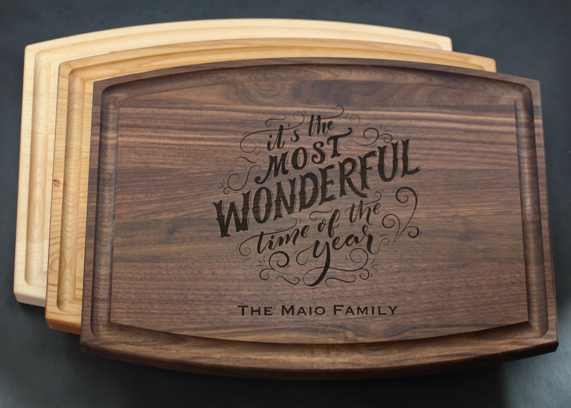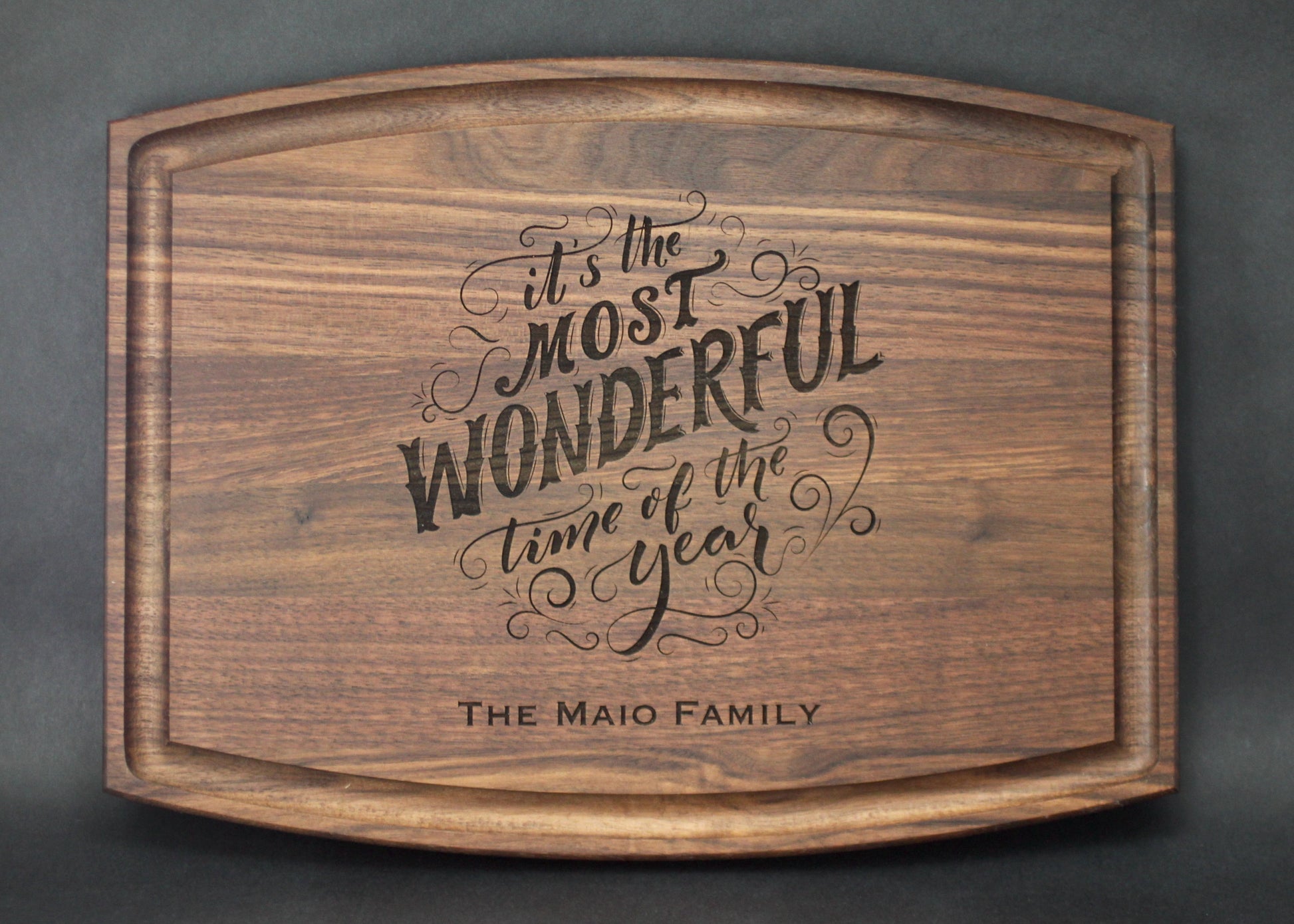 This high-quality cutting board, engraved with This is the Most Wonderful Time of the Year and personalized with your family name or short phrase, makes an unforgettable Holiday centerpiece and gorgeous Christmas serving board. Our laser engraved cutting boards makes a memorable gift. Truly unique, this premium hardwood cutting board is easy to maintain and gentle on knives. The lasting beauty of the Most Wonderful Time of the Year engraving makes it one of our top selling Christmas cutting boards.
