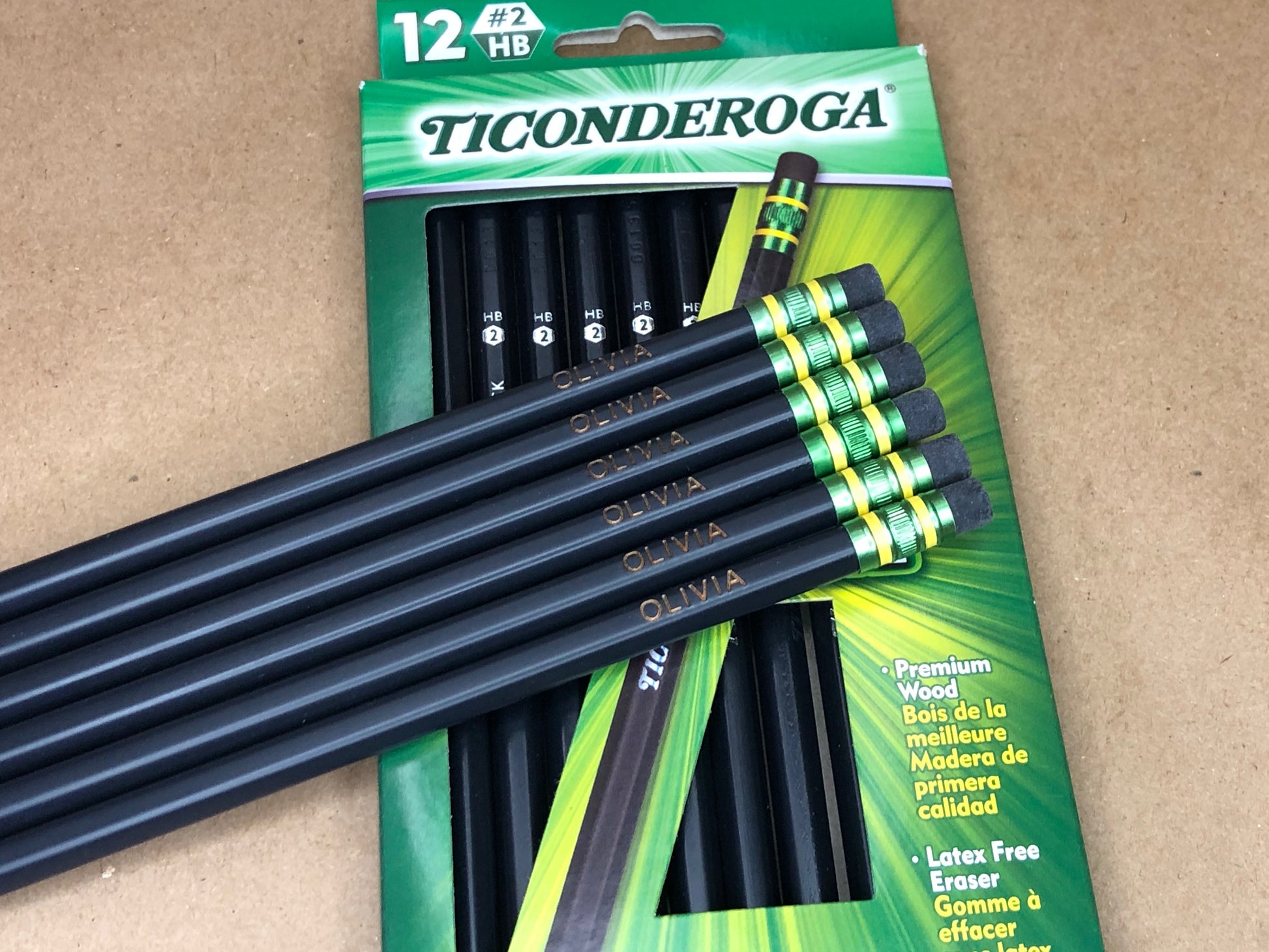 12 Pack of #2 Ticonderoga Black Pencils engraved with your name or phrase. This is a perfect way to keep items identified when going back to school. The engraving is deep and will not wear off or disappear. The order is for 12 pencils and with the same name/phrase on all.