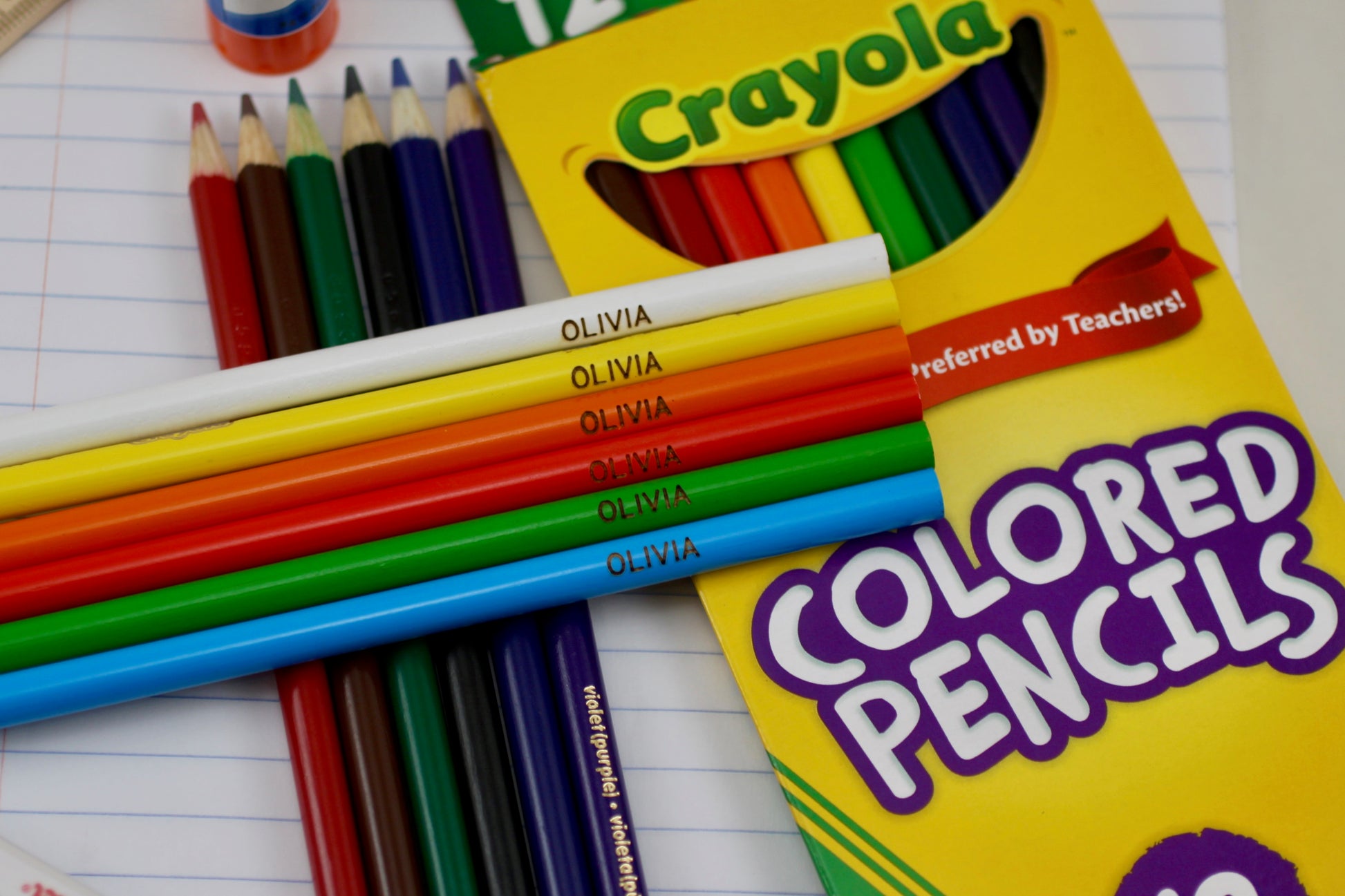 12 or 24 Pack of Crayola Colored Pencils engraved with your name or phrase. This is a perfect way to keep items identified when going back to school. The engraving is deep and will not wear off or disappear. The order is for 12 or 24 pencils, with the same name/phrase on all.