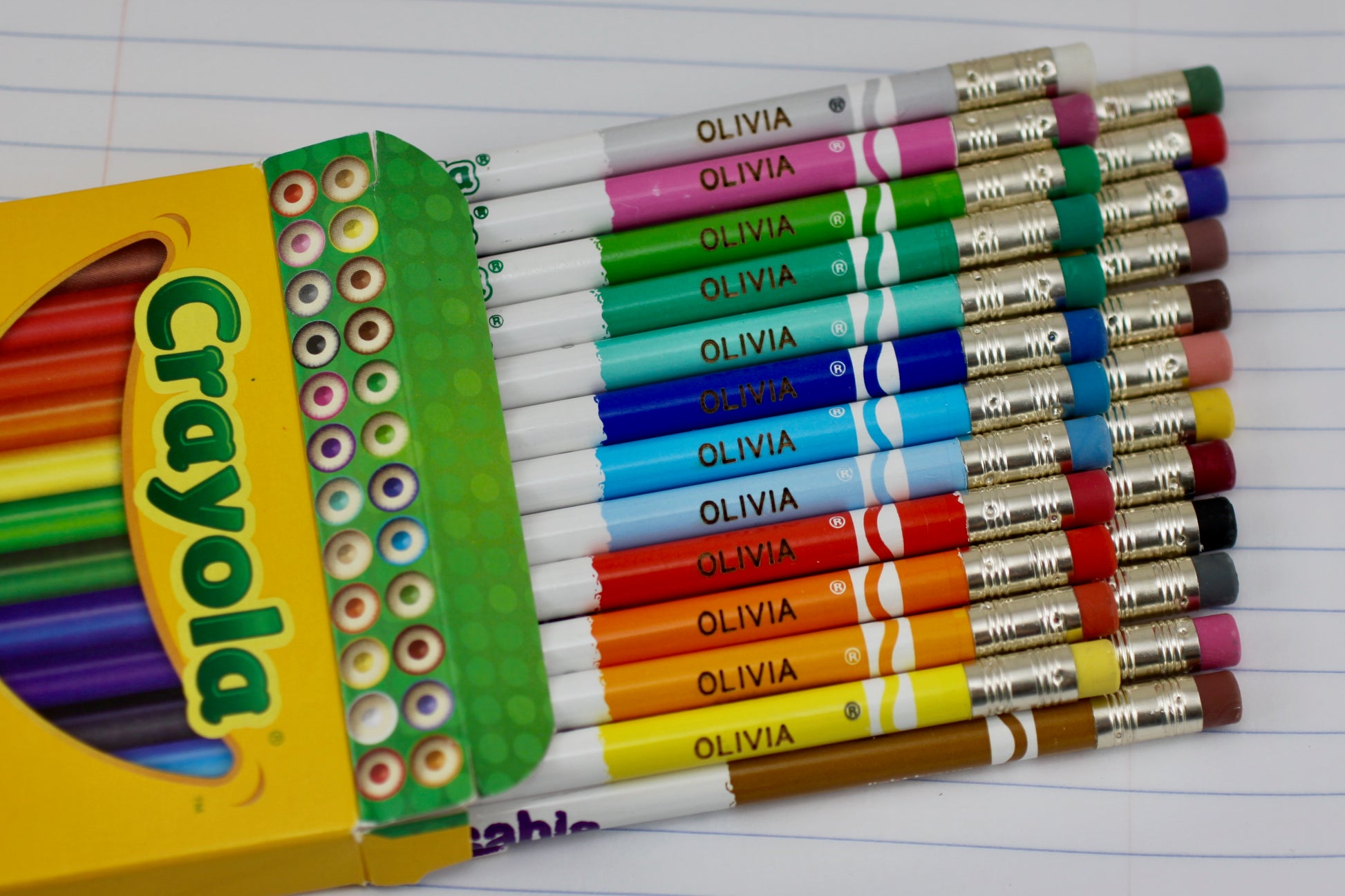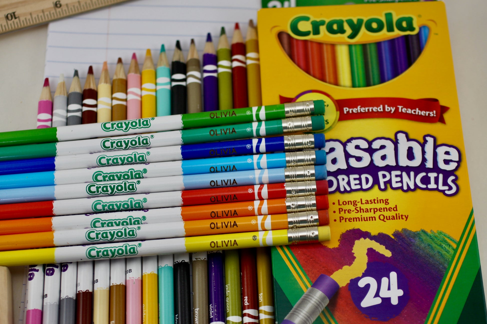 24 Pack of Crayola Erasable Colored Pencils engraved with your name or phrase. This is a perfect way to keep items identified when going back to school. The engraving is deep and will not wear off or disappear. The order is for 24 pencils, with the same name/phrase on all.