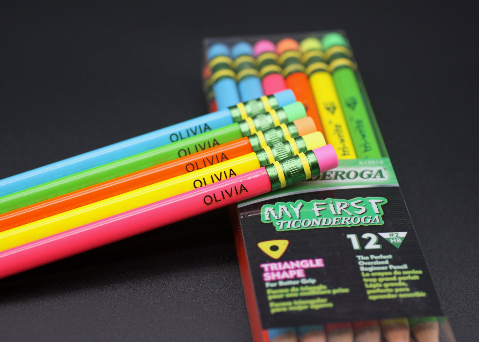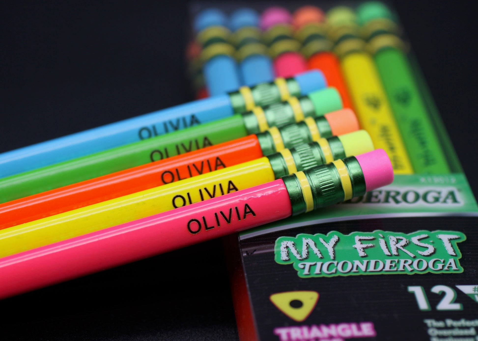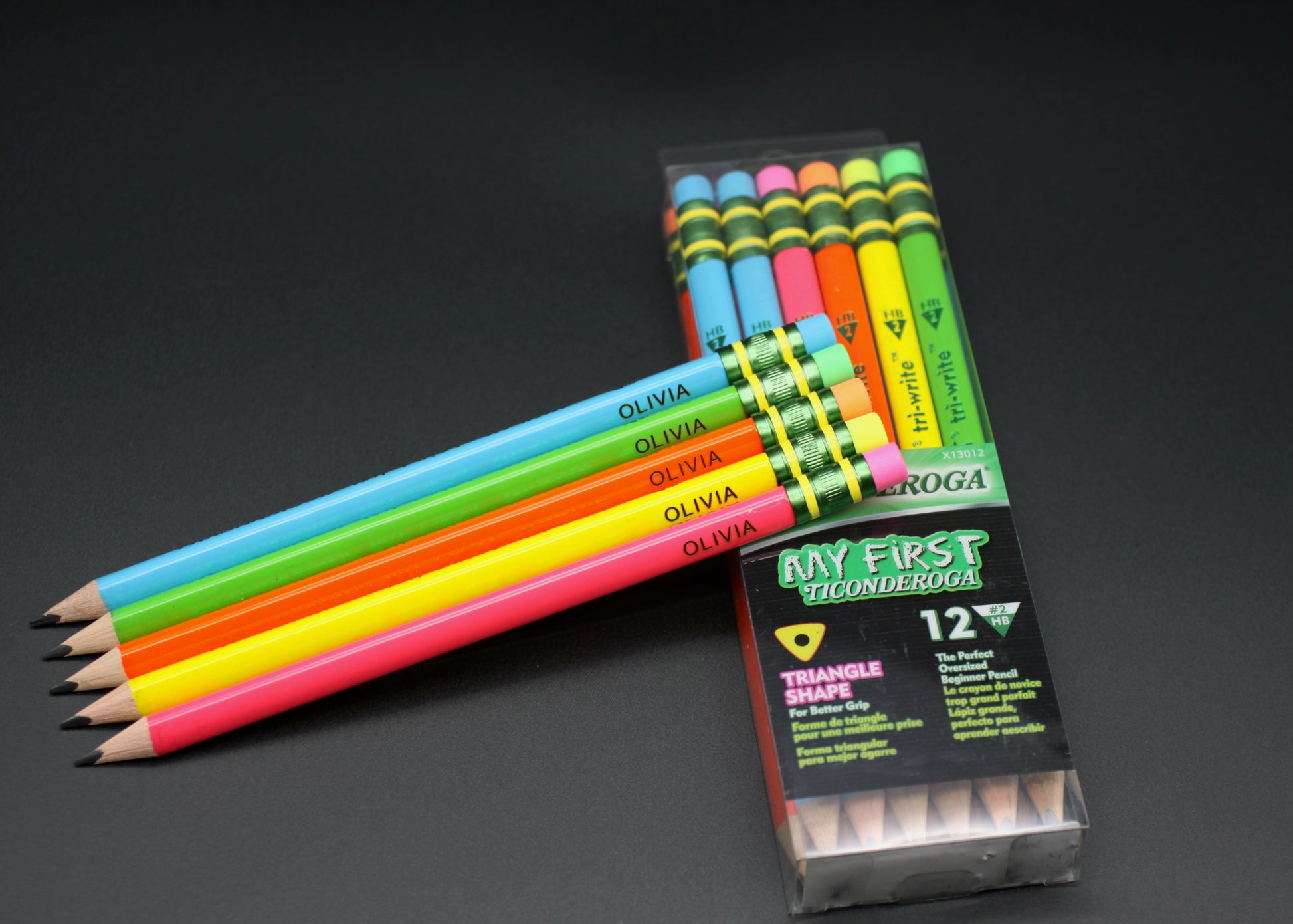 12 Pack of Ticonderoga My First Tri-write Wood-Cased Pencils in Neon Colors engraved with your name or phrase. This is a perfect way to keep items identified when going back to school. The engraving is deep and will not wear off or disappear. The order is for 12 My 1st Ticonderoga pencils and with the same name/phrase on all.