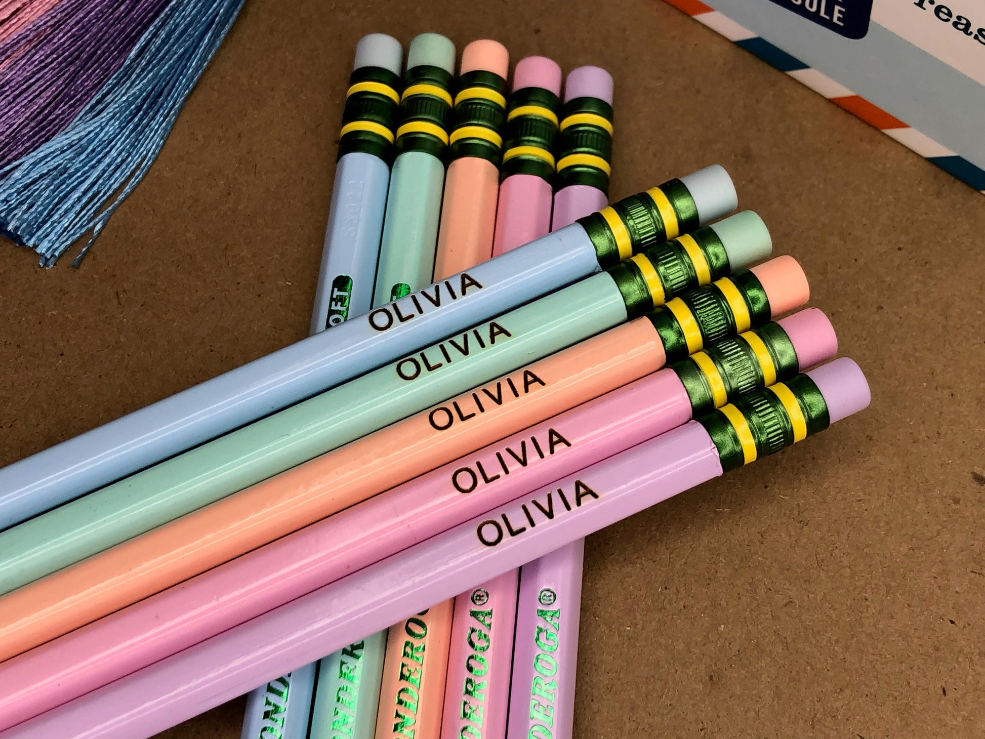 5 or 10 Pack of #2 Ticonderoga Pastel Wood Case #2 Pencils engraved with your name or phrase. This is a perfect way to keep items identified when going back to school. The engraving is deep and will not wear off or disappear. The order includes a single name/phrase engraved on pencils all.