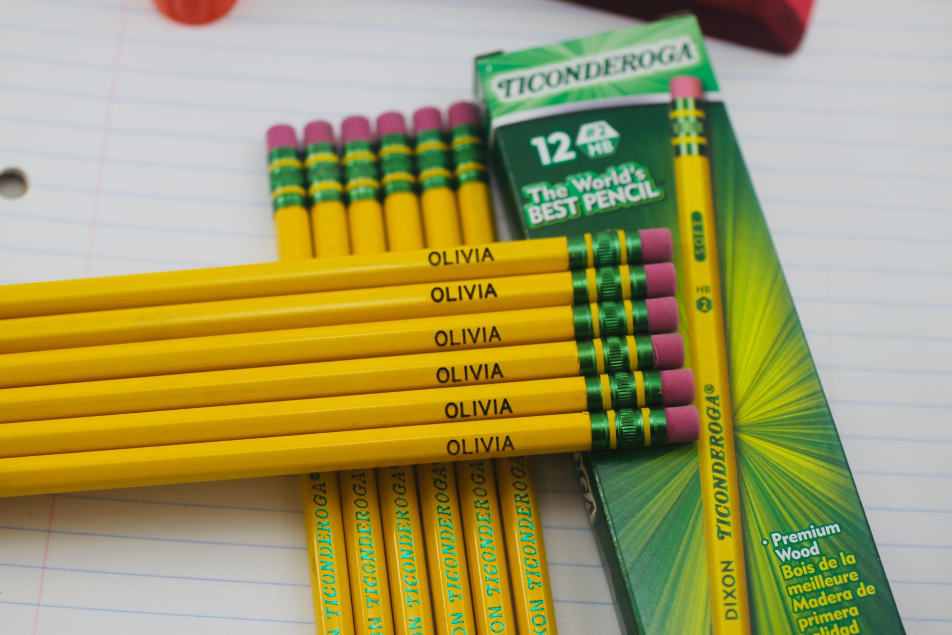 12 Pack of #2 Ticonderoga Pencils engraved with your name or phrase. This is a perfect way to keep items identified when going back to school. The engraving is deep and will not wear off or disappear. The order is for 12 pencils and with the same name/phrase on all.