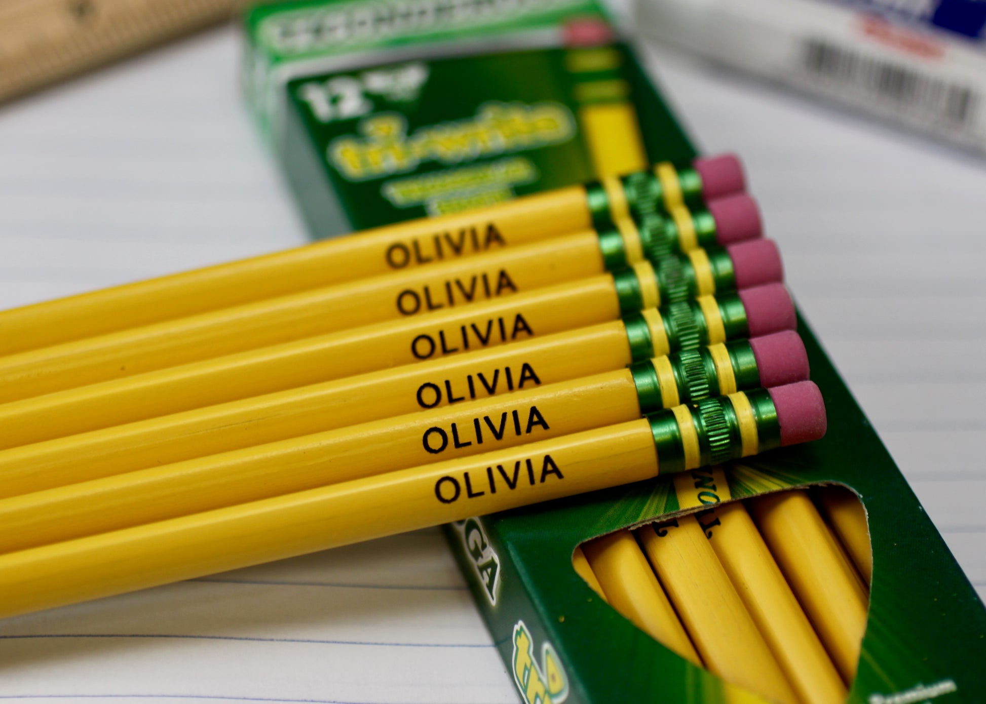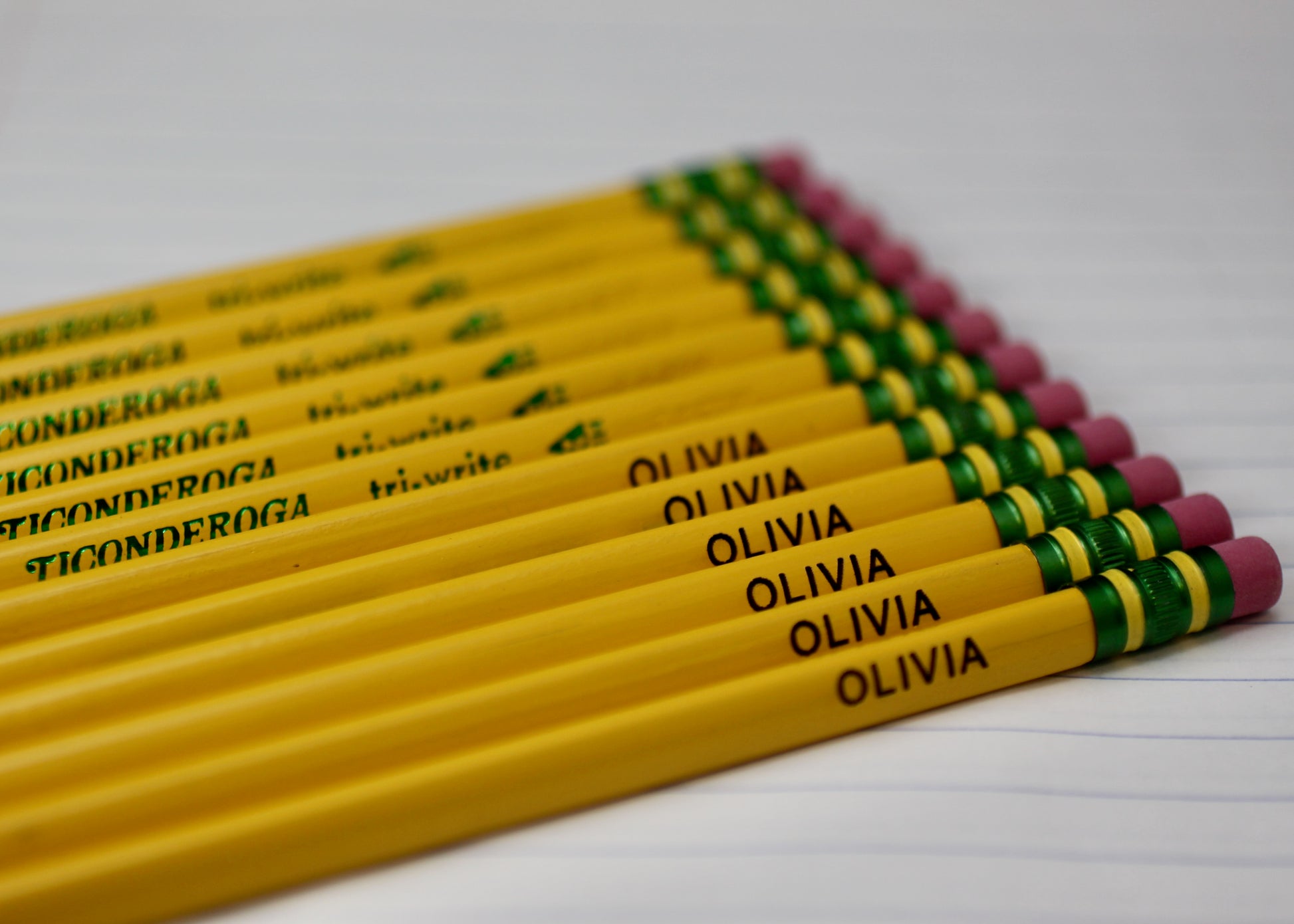 12 Pack of #2 Ticonderoga Tri-Write Wood-Cased Pencils engraved with your name or phrase. This is a perfect way to keep items identified when going back to school. The engraving is deep and will not wear off or disappear. The order is for 12 pencils and with the same name/phrase on all.