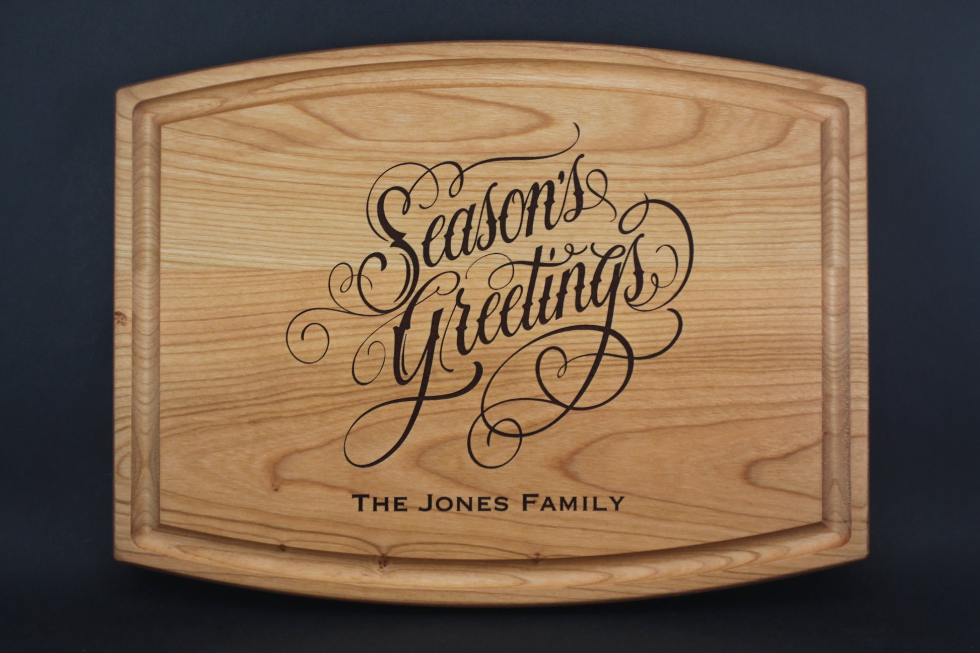 This high-quality cutting board, engraved with Season's Greetings and personalized with your family name or short phrase, makes an unforgettable Christmas centerpiece and gorgeous Christmas serving board. Our laser engraved cutting boards makes a memorable gift. Truly unique, this premium hardwood cutting board is easy to maintain and gentle on knives. The lasting beauty of the Season's Greetings engraving makes it one of our top selling Christmas cutting boards.