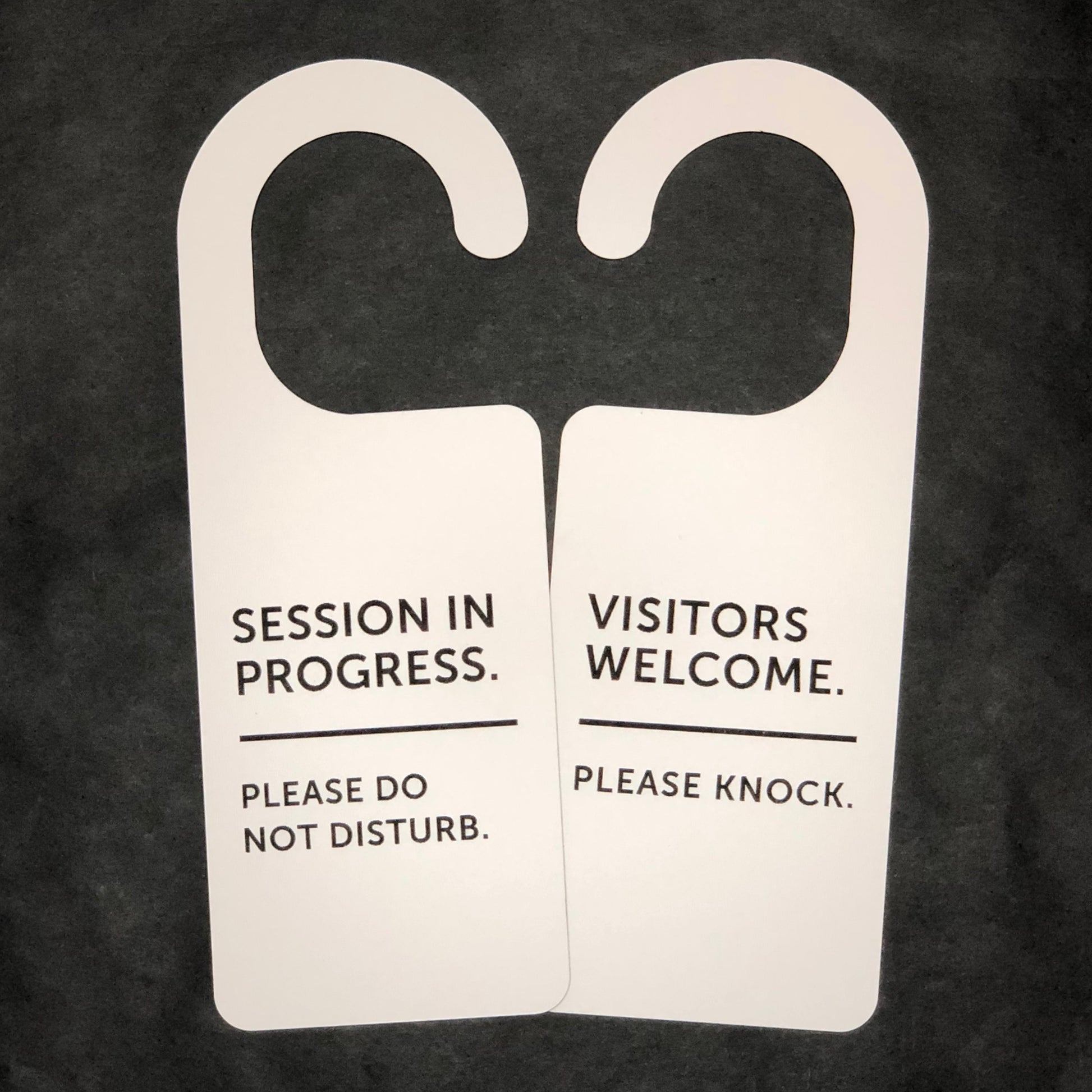 The Sessions In Progress door hanger design is laser engraved from high-quality UV stable acrylic that is suitable for both indoor and outdoor use.